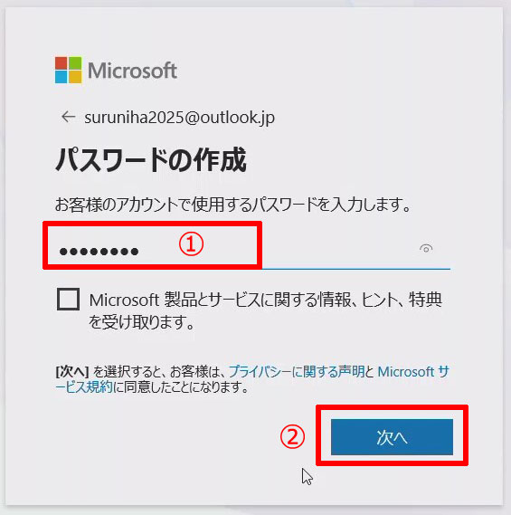 【19】[パスワードの作成]ダイアログが表示されるので、(1)自分で考えたパスワードを入力します(何を入力しても●で表示されます)(2)右下の[次へ]ボタンをクリックします